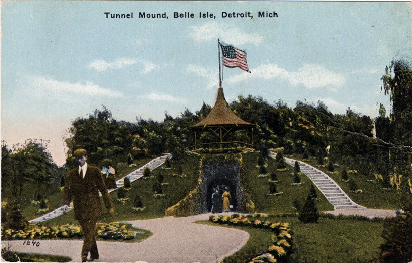View of landscaped hill with open-air pavilion and American flag at the top; steps lead to pavilion on both sides of hill. Two women enter a tunnel cut through the hill; man walks on path in foreground. Printed on front: "Tunnel mound, Belle Isle, Detroit, Mich." Printed on back: "Tunnel mound at Belle Isle, Detroit, Mich. This mound is near the casino on Belle Isle. A cascade flows down its sides and an archway runs through the center. Steps lead to the rest house on the top of mound. Pub. by United News Co., Detroit, Mich."