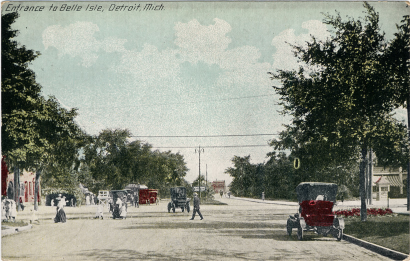 Favorite this☆ Approach to Belle Isle bridge Description: View of cars and pedestrians on tree-lined boulevard leading to Belle Isle bridge. Printed on front: "Entrance to Belle Isle, Detroit, Mich." Handwritten on back in upper right corner: "9/9/12." Details Resource ID: bh002895 Subject: Belle Isle Park (Detroit, Mich.) Streets--Michigan--Detroit Automobiles--Michigan--Detroit Postcards Date Issued: Unknown year Format: 1 postcard : col. ; 3.5 x 5.5 in. Member of: Burton Historical Collection Filing Location: D/Parks-Belle Isle Rights: Physical rights are retained by DPL. Copyright is retained in accordance with U.S. copyright laws.