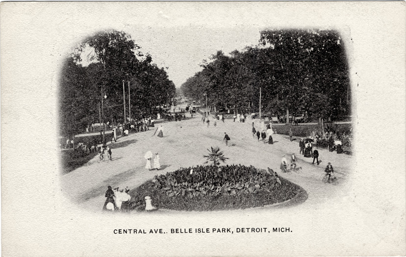 View of Central Avenue on Belle Isle. Circular garden bed in foreground; pedestrians and bicyclists travel in road. Printed on front: "Central Ave., Belle Isle Park, Detroit, Mich." Printed on back: "Souvenir postal card issued by the Detroit News, the great daily of Michigan."