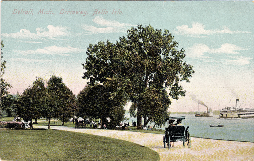 View of horse-drawn carriage on curved tree-lined road on Belle Isle; steamboats on river in distance. Printed on front: "Detroit, Mich. Driveway, Belle Isle." Printed on back: "No. 129, A.C. Dietsche, Detroit, Mich. and Frankfort, Germany. Will call on or about ... representing Fairbanks, Morse & Co., scales, etc."