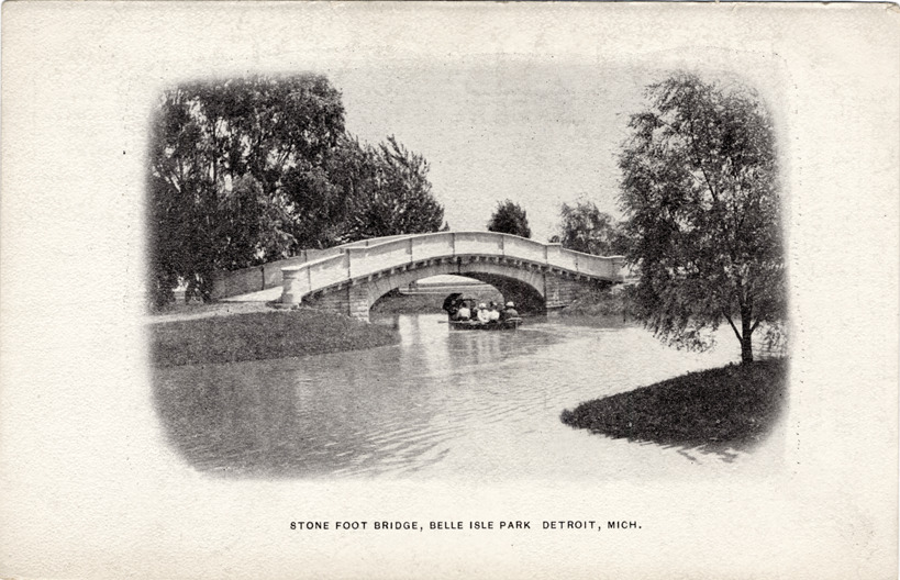 View of group of men and women in rowboat passing under arched stone bridge on Belle Isle canal. Printed on front: "Stone foot bridge, Belle Isle Park, Detroit, Mich." Printed on front: "Souvenir postal card issued by the Detroit News, the great daily of Michigan."