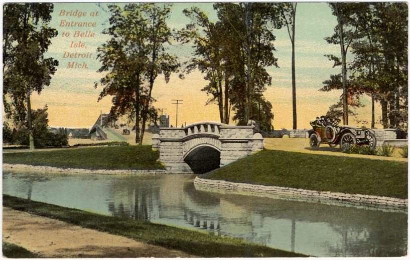 View of arched stone bridge over canal on Belle Isle; bridge leading to Belle Isle in background. Motorcar travels on road; canal in foreground. Printed on front: "Bridge at entrance to Belle Isle, Detroit, Mich." Printed on back: "19314, Bridge at entrance to Belle Isle. Canoeing is the leading sport at Belle Isle, Detroit's leading playground. Its 702 acres are threaded with many miles of canals and lakes, affording an ideal spot in which the light little craft cruise about by thousands. Band concerts are given at the city's expense during the summer afternoons and evenings, and on such occasions the canoeists are present in great numbers."