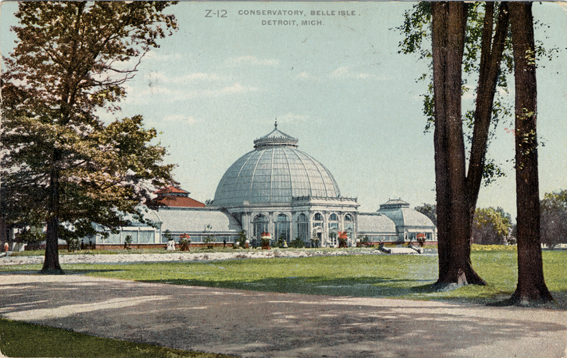 View from across lawn of Belle Isle Conservatory; glass-paned building has central dome and side wings. Printed on front: "Conservatory, Belle Isle. Detroit, Mich., Z-12." Handwritten on back: "5/4/10. Rec'd your letter this p.m. Glad to hear everything is O.K. Yesterday and today have been two fine days. We go to Mt. Clemens tomorrow to play the High School there. I am going to do the pitching. Feeling pretty good. Will write tomorrow eve." Card is postmarked May 5, 1910.