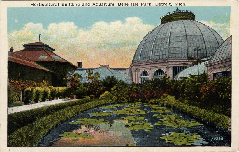 View of Horticultural Building and Aquarium on Belle Isle. Glass-paned building with dome is attached to aquarium building; pond with water lilies in foreground. Printed on front: "Horticultural Building and Aquarium, Belle Isle Park, Detroit, Mich., 16368." Printed on back: "Horticultural Bldg., Belle Isle, Detroit, Mich. The Horticultural building on Belle Isle is well worth seeing. It is stored with rare and beautiful shrubs and flowers, which has taken the Park and Boulevard Commission years to collect. It is situated near the center of the island and is thronged with visitors the year around."