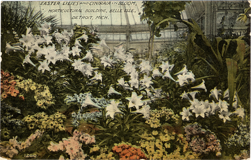 View of lilies and other flowers, possibly cineraria, inside the Horticultural Building on Belle Isle. Printed on front: "Easter lilies and ciniraia in bloom, Horticultural Building, Belle Isle, Detroit, Mich." Handwritten on back in upper right corner: "7/9/10."