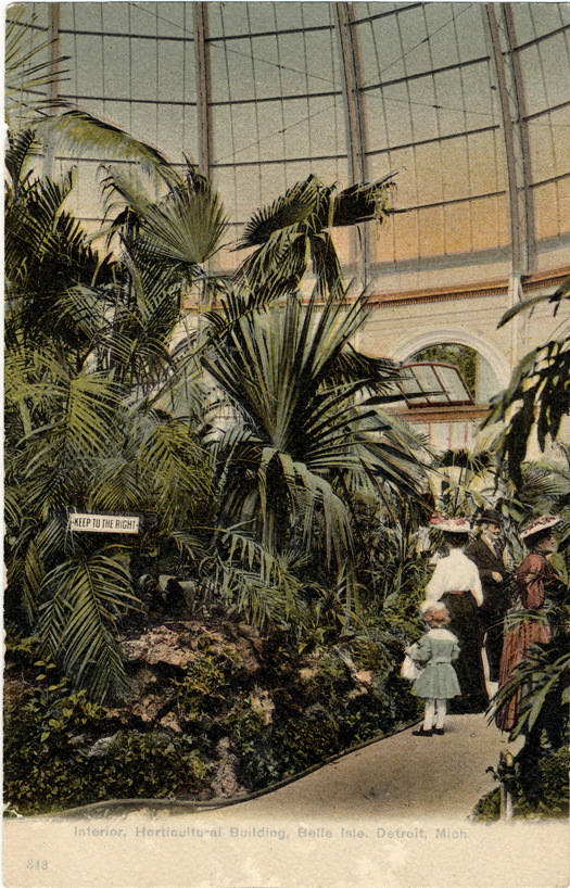 View of palms displayed inside Horticultural Building on Belle Isle. Two women, a man and a young girl stand in path next to plants; glass-paned dome overhead. Sign in front of palms: "Keep to the right." Printed on front: "Interior, Horticultural Building, Belle Isle, Detroit, Mich., 343." Printed on back: "H.L. Woehler, Buffalo, N.Y. & Dresden, Germany."