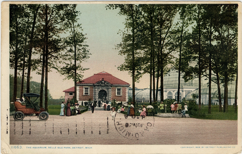 View of crowd gathered in front of Aquarium on Belle Isle; brick building has ornate stone entrance. Belle Isle Conservatory is visible behind grove of trees. Printed on front: "11663, the Aquarium, Belle Isle Park, Detroit, Mich. Copyright, 1908, by Detroit Publishing Co." Printed on back: "Phostint card, made only by Detroit Publishing Co." Handwritten on back: "6/19/08, Will be home Sunday, George." Card is postmarked June 19, 1908.