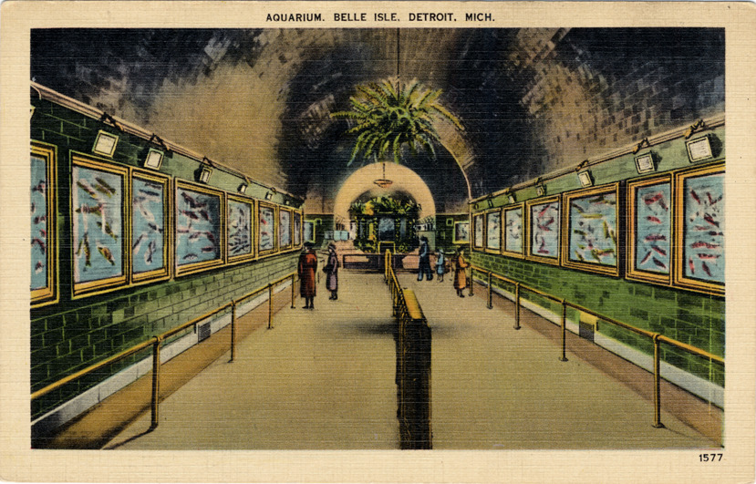 View of interior of Aquarium on Belle Isle; visitors look at fish tanks along corridor walls. Potted ferns hang from tiled and barrel-vaulted ceilings. Printed on front: "Aquarium, Belle Isle, Detroit, Mich." Printed on back: "1577, the Aquarium on Belle Isle is one of the most popular attractions on the island. In it will be found all kinds of fresh and salt water fish. The Commission brings the water direct from the ocean for the latter. This card shows the interior view." Miller Art Co. and Metropolitan Metrocraft publisher trademarks on verso.