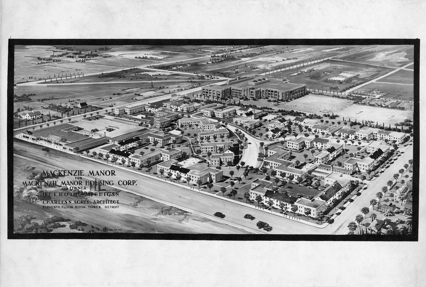 Favorite this☆ Mackenzie Manor Description: Aerial view of Mackenzie Manor. Printed on photo front: "Mackenzie Manor for Mackenzie Manor Housing Corp., owner. Detroit, Michigan. Charles N. Agree, architect. Eleventh floor, Book Tower, Detroit." Stamped on photo back: "Chas N. Agree, architect. Received Sep. 28, 1939. Eleventh floor, Book Tower, Detroit, Mich." Stamped on photo back: "Grossman-Kn -- , photographic illustrators, 305 W. Congress, Cherry 5800, Detroit, Mich." Details Resource ID: bh002947 Creator: Grossman-Knowling Subject: Architecture, Domestic--Michigan--Detroit Agree, Charles N. (Charles Nathanial), 1897-1982 Architects--Michigan--Detroit Architectural rendering--Michigan--Detroit Photographic prints Date Issued: 1939 Format: 1 photographic print ; 6.5 x 9.5 in. Member of: Burton Historical Collection Filing Location: MS/Agree, Charles N. Rights: Physical rights are retained by DPL. Copyright is retained in accordance with U.S. copyright laws.