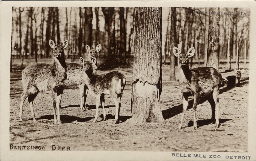 Favorite this☆ Deer at Belle Isle Zoo Description: View of barasingha deer in wooded area at Belle Isle Zoo. Printed on front: "Barasinga deer." Stamped on front: "Belle Isle Zoo, Detroit. Photo by Strachota." Details Resource ID: bh002962 Creator: Strachota Subject: Belle Isle Park (Detroit, Mich.) Deer--Michigan--Detroit Zoos--Michigan--Detroit Photographic prints Postcards Date Issued: Unknown year Format: 1 postcard ; 3.5 x 5.5 in. Member of: Burton Historical Collection Filing Location: D/Parks-Belle Isle-Zoo Rights: Physical rights are retained by DPL. Copyright is retained in accordance with U.S. copyright laws.