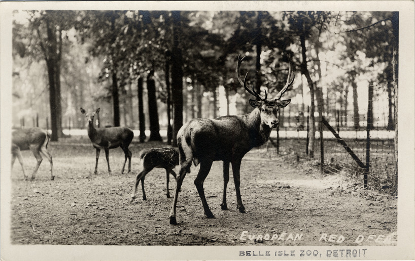 Favorite this☆ Deer at Belle Isle Zoo Description: View of red deer inside fenced enclosure at Belle Isle Zoo. Printed on front: "European red deer." Stamped on front: "Belle Isle Zoo, Detroit." Details Resource ID: bh002968 Subject: Belle Isle Park (Detroit, Mich.) Red deer--Michigan--Detroit Zoos--Michigan--Detroit Postcards Photographic prints Date Issued: Unknown year Format: 1 postcard ; 3.5 x 5.5 in. Member of: Burton Historical Collection Filing Location: D/Parks-Belle Isle-Zoo Rights: Physical rights are retained by DPL. Copyright is retained in accordance with U.S. copyright laws.