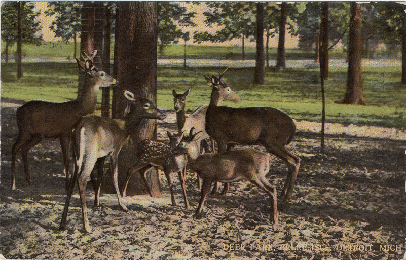 View of deer and fawns inside fenced enclosure at Belle Isle Zoo; trees in background. Printed on front: "Deer Park, Belle Isle, Detroit, Mich." Printed on back: "Deer Park, Belle Isle, Detroit, Mich. The Deer Park at Belle Isle is one of the many attractions at this beautiful resort. There are a large number of these animals in the herd of which this view shows but a few. C.T. Co., Chicago, R-27328." Handwritten on back: "Detroit, June 29. Dear Mother, I am well. Hope you are the same it is terable [sic] warm if nothing happens I will be down to see you Friday. Charley." Card is postmarked June 29, 1913.