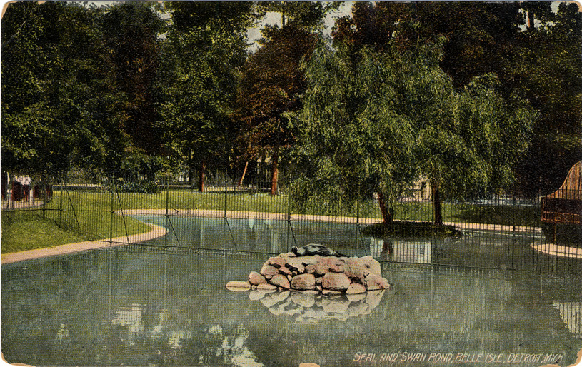 View of seal resting on rocks in the middle of a pond at Belle Isle Zoo. Pond is separated by fence; pavilion and trees on other side of fence in background. Printed on front: "Seal and swan pond, Belle Isle, Detroit, Mich." Printed on back: "Wolverine News Co., Detroit. Printed in Germany." Handwritten on back: "My work is finally over and it has been delightful. Shall go home some time tomorrow, hope you are rested after your ... [rest undecipherable]." Card is postmarked September 5, 1907.