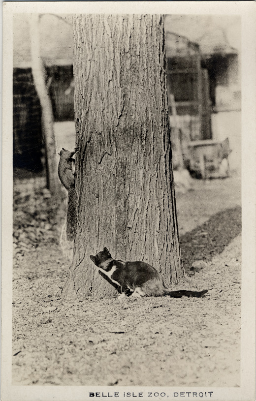 Favorite this☆ Squirrel and cat at Belle Isle Zoo Description: View of cat watching squirrel climbing on tree at Belle Isle Zoo. Stamped on front: "Belle Isle Zoo, Detroit." Details Resource ID: bh002988 Subject: Belle Isle Park (Detroit, Mich.) Squirrels--Michigan--Detroit Cats--Michigan--Detroit Zoos--Michigan--Detroit Photographic prints Postcards Date Issued: Unknown year Format: 1 postcard ; 5.5 x 3.5 in. Member of: Burton Historical Collection Filing Location: D/Parks-Belle Isle-Zoo Rights: Physical rights are retained by DPL. Copyright is retained in accordance with U.S. copyright laws.