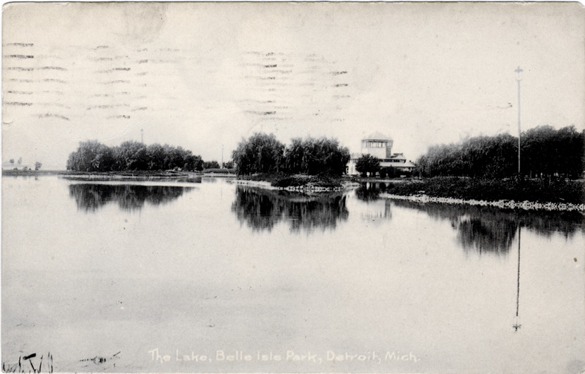 View of lake at Belle Isle with pavilion and trees in background. Printed on front: "The Lake, Belle Isle Park, Detroit, Mich." Printed on back: "D3827a, the Rotograph Co., N.Y., City, (Germany)." Handwritten on back: "Just to let you know Mr. Sweet died Monday night - I have just come from the funeral. He is to be buried in Woodstock ... Mr. Wright was here to dinner with us last night. Carlos is spending his vacation in Flint. I took him out on Monday-Thursday. E.W.P." Card is postmarked April 17, 1908.