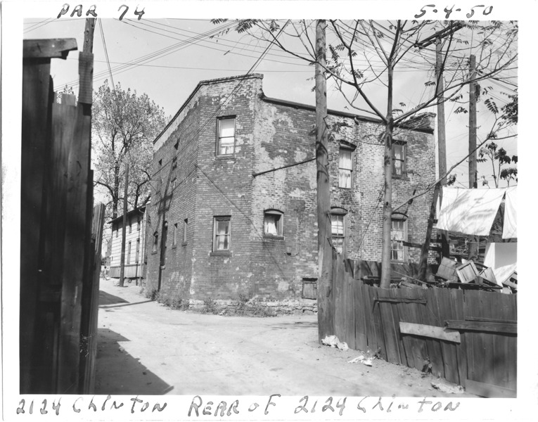 Rear view of two-story brick residential building, possibly an apartment building, located at 2124 Clinton, parcel 74, in the area bounded by Dequindre/Chene/Clinton/Macomb, site 2-S-6. Handwritten on front: "Par. 74, 2124 Clinton, rear of 2124 Clinton, 5-4-50."