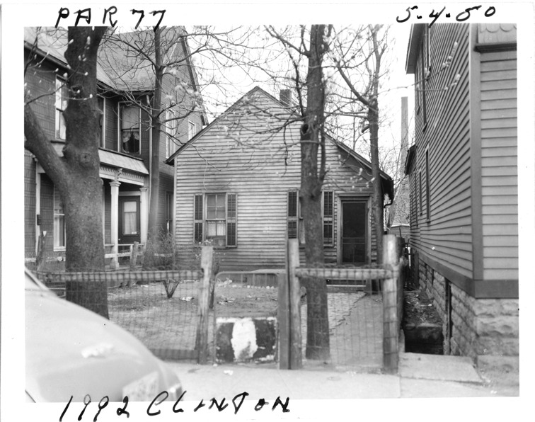View of one-story wooden-frame house located at 1992 Clinton, parcel 77, in the area bounded by Dequindre/Chene/Clinton/Macomb, site 2-S-6. Fence borders front yard. Handwritten on front: "Par. 77, 1992 Clinton, 5-4-50."