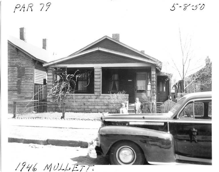 View of one-story house with simulated brick and stone siding and covered entry porch located at 1946 Mullett, parcel 79, in the area bounded by Dequindre/Chene/Clinton/Macomb, site 2-S-6. Two young children stand in front of house. Handwritten on front: "Par. 79, 1946 Mullett, 5-8-50."