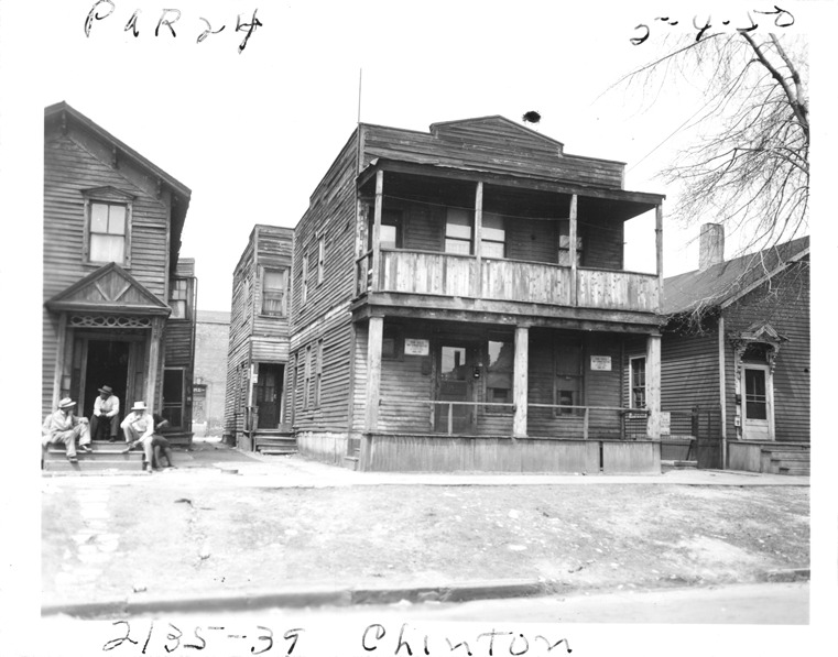 View of two-story wooden-frame house with flat roof, covered entry porch and second floor balcony located at 2135-2139 Clinton, parcel 24, in the area bounded by Dequindre/Chene/Clinton/Mullett, site 2-S-7. "For sale" signs on front of building. Group of men sit on porch of adjacent residence. Handwritten on front: "Par. 24, 2135-39 Clinton, 5-4-50."