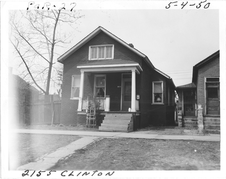 View of two-story front-gabled wooden-frame house with covered entry porch located at 2155 Clinton, parcel 27, in the area bounded by Dequindre/Chene/Clinton/Mullett, site 2-S-7. Trellis in front of porch. Handwritten on front: "Par. 27, 2155 Clinton, 5-4-50."
