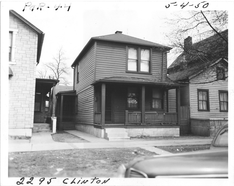 View of two-story wooden-frame house with hipped roof and covered entry porch located at 2295 Clinton, parcel 44, in the area bounded by Dequindre/Chene/Clinton/Mullett, site 2-S-7. Handwritten on front: "Par. 44, 2295 Clinton, 5-4-50."