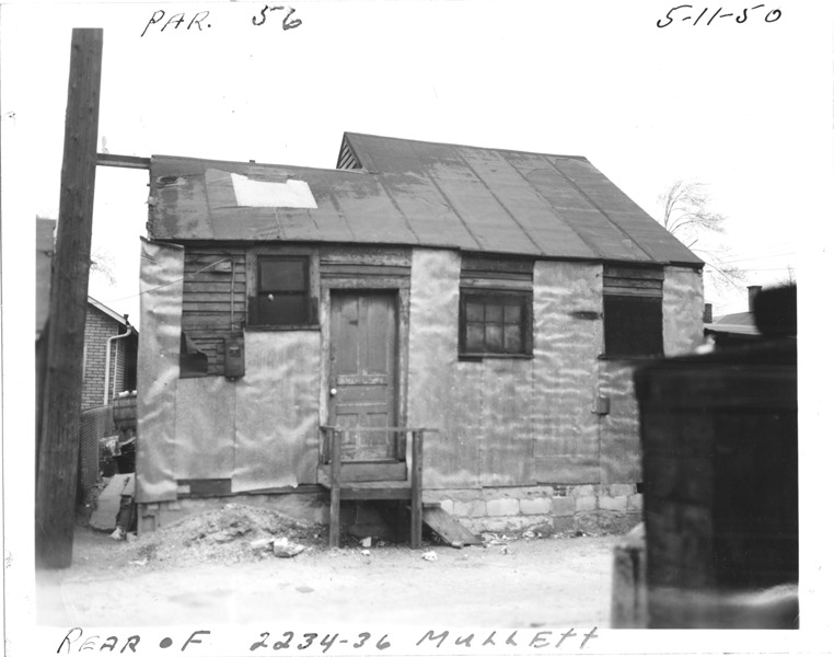 Rear view of wooden-frame house located at 2234-2236 Mullett, parcel 56, in the area bounded by Dequindre/Chene/Clinton/Mullett, site 2-S-7. Handwritten on front: "Par. 56, 2234-36 Mullett, 5-11-50."