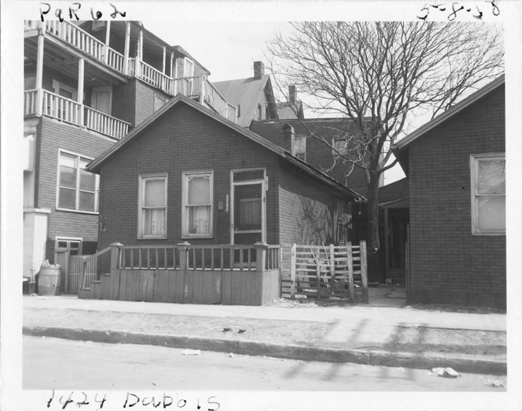 View of one-story front-gabled house with simulated brick siding located at 1424 Dubois, parcel 62, in the area bounded by Dequindre/Chene/Clinton/Mullett, site 2-S-7. Handwritten on front: "Par. 62, 1424 Dubois, 5-8-50."