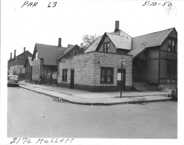 View of one-story house with flat roof and simulated stone siding located at 2176 Mullett, parcel 63, in the area bounded by Dequindre/Chene/Clinton/Mullett, site 2-S-7. Building is on corner of Dubois and Mullett. Handwritten on front: "Par. 63, 2176 Mullett, 5-10-50."