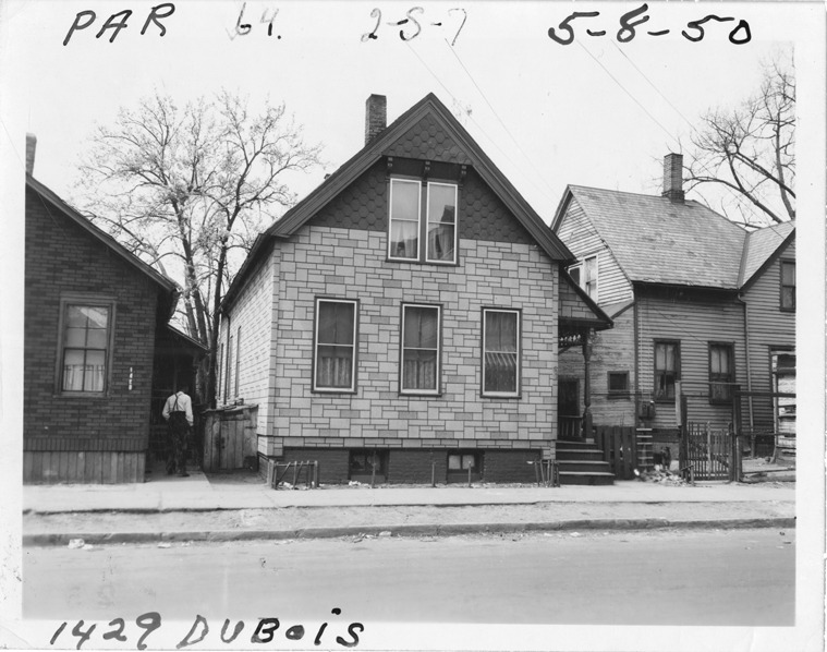 View of two-story front-gabled house with simulated stone siding located at 1429 Dubois, parcel 64, in the area bounded by Dequindre/Chene/Clinton/Mullett, site 2-S-7. Handwritten on front: "Par. 64, 1429 Dubois, 2-S-7, 5-8-50."
