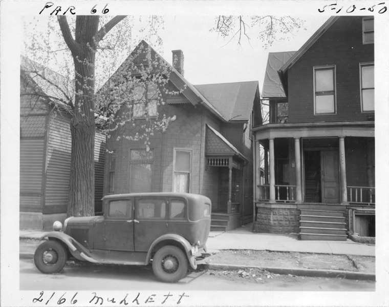 View of two-story house with shingle siding located at 2166 Mullett, parcel 66, in the area bounded by Dequindre/Chene/Clinton/Mullett, site 2-S-7. Car parked in street. Handwritten on front: "Par. 66, 2166 Mullett, 5-10-50."