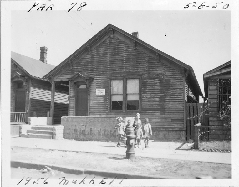 View of one-story front-gabled wooden-frame house located at 1956 Mullett, parcel 78, in the area bounded by Dequindre/Chene/Clinton/Mullett, site 2-S-7. "For sale" sign on house; group of children stand on sidewalk. Handwritten on front: "Par. 78, 1956 Mullett, 5-8-50."