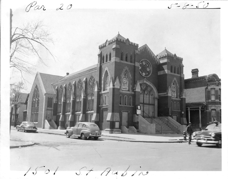 Front and side view of brick church building with square towers, rose window and stained glass windows located at 1501 St. Aubin, parcel 20, in the area bounded by Dequindre/Chene/Mullett/Madison, site 2-S-8. Cars parked in street. Handwritten on front: "Par. 20, 1501 St. Aubin, 5-8-50." 1950 Yellow Pages directory lists Greater Macedonia Baptist Church.