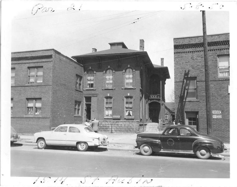 View of two-story brick Italianate house with hipped roof and cupola located at 1514 St. Aubin, parcel 21, in the area bounded by Dequindre/Chene/Mullett/Madison, site 2-S-8. City of Detroit car parked in street; men and women stand on sidewalk. Handwritten on front: "Par. 21, 1514 St. Aubin, 5-8-50."