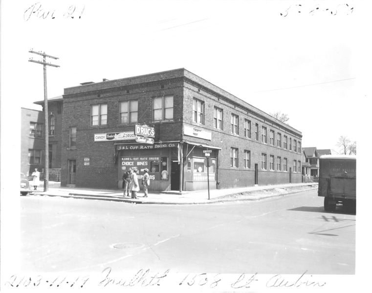 View of two-story brick commercial building located at 2103-2111-2119 Mullett and 1508 St. Aubin, parcel 21, in the area bounded by Dequindre/Chene/Mullett/Madison, site 2-S-8. S & L Cut Rate Drug Co. on corner; three men stand on sidewalk. Handwritten on front: "Par. 21, 2103-11-19 Mullett, 1508 St. Aubin, 5-8-50."