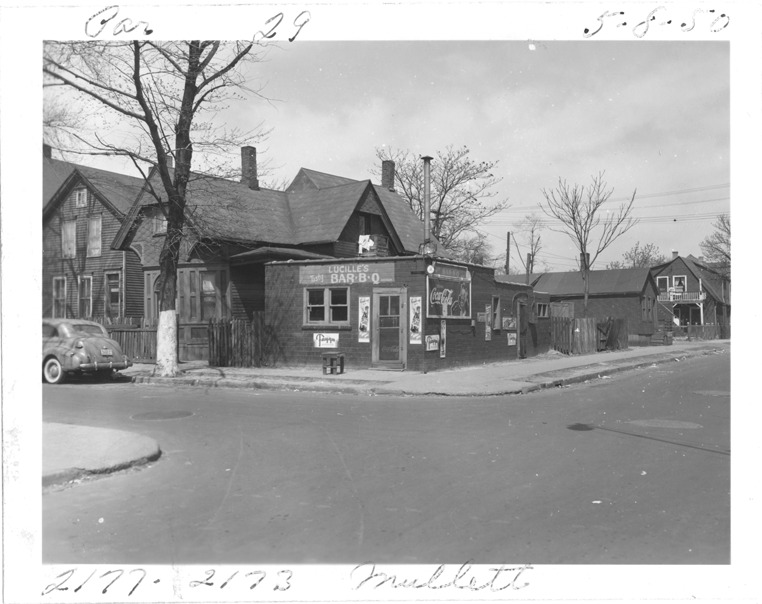 View of one-story building with flat roof located at 2177-2173 Mullett, parcel 29, in the area bounded by Dequindre/Chene/Mullett/Madison, site 2-S-8. Sign on building: "Lucille's Bar-B-Q." Coca-Cola and Faygo advertisements on building. Handwritten on front: "Par. 29, 2177-2173 Mullett, 5-8-50."