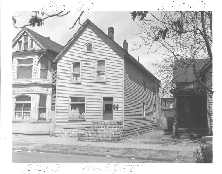 View of two-story front-gabled wooden-frame house with stone foundation located at 2213 Mullett, parcel 30, in the area bounded by Dequindre/Chene/Mullett/Madison, site 2-S-8. Handwritten on front: "Par. 30, 2213 Mullett, 5-8-50."