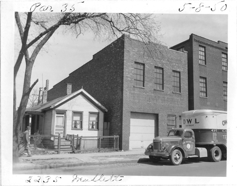 View of two-story brick commercial building with garage door located at 2235 Mullett, parcel 35, in the area bounded by Dequindre/Chene/Mullett/Madison, site 2-S-8. Owl Moving & Storage Co. truck parked in front of building. View of adjacent residence at 2231 Mullett. Handwritten on front: "Par. 35, 2235 Mullett, 5-8-50."
