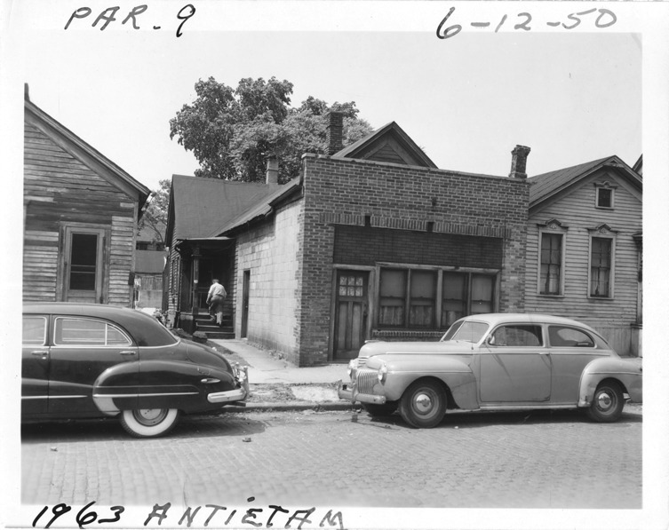 View of one-story wooden-frame building with brick addition in front located at 1963 Antietam, parcel 9, in the area bounded by Dequindre/St. Aubin/Antietam/Waterloo, site 2-S-12. Automobiles parked in street; man walks up stairs at side entrance. Handwritten on front: "Par. 9, 1963 Antietam, 6-12-50."