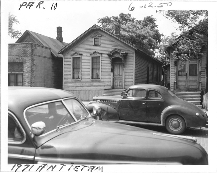View of one-story front-gabled wooden-frame house located at 1971 Antietam, parcel 10, in the area bounded by Dequindre/St. Aubin/Antietam/Waterloo, site 2-S-12. Automobiles parked in street. Handwritten on front: "Par. 10, 1971 Antietam, 6-12-50."