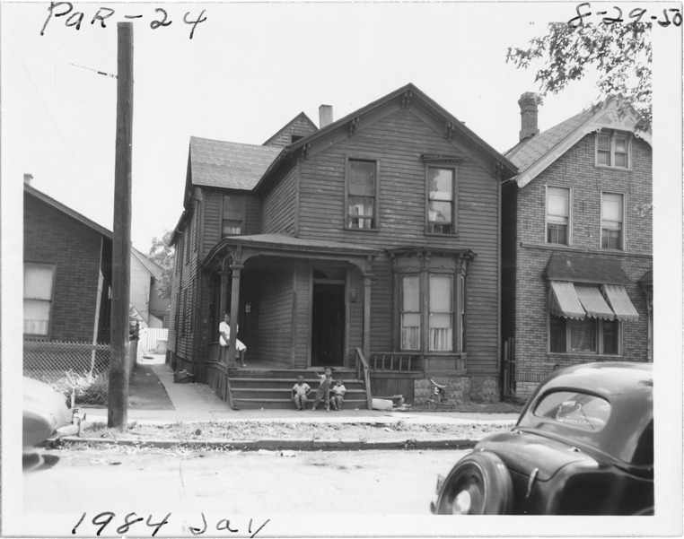 View of two-story wooden-frame house located at 1984 Jay, parcel 24, in the area bounded by Dequindre/St. Aubin/Antietam/Waterloo, site 2-S-12. Woman and three children sit on porch. Handwritten on front: "Par. 24, 1984 Jay, 8-29-50."