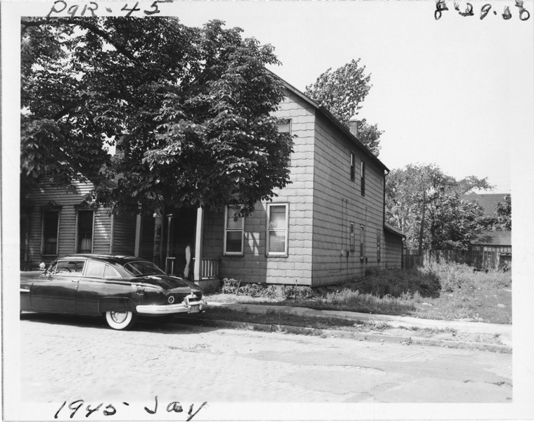 View of two-story front-gabled house with shingle siding located at 1945 Jay, parcel 45, in the area bounded by Dequindre/St. Aubin/Antietam/Waterloo, site 2-S-12. House is partially obscured by trees; automobile parked in street. Handwritten on front: "Par. 45, 1945 Jay, 8-29-50."
