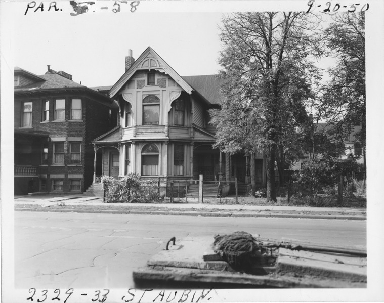 View of two-story wooden-frame Victorian style house located at 2329-2333 St. Aubin, parcel 58, in the area bounded by Dequindre/St. Aubin/Antietam/Waterloo, site 2-S-12. Handwritten on front: "Par. 58, 2329-33 St. Aubin, 9-20-50."