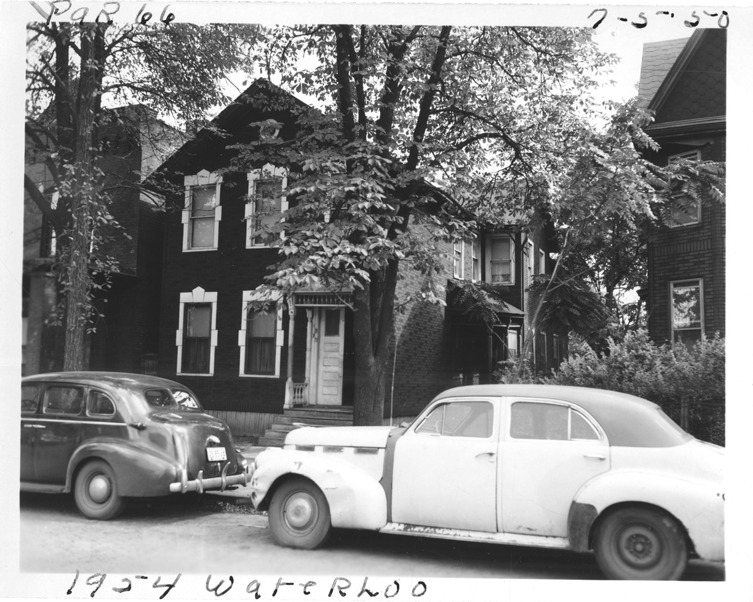 View of two-story front-gabled house with simulated brick siding located at 1954 Waterloo, parcel 65, in the area bounded by Dequindre/St. Aubin/Antietam/Waterloo, site 2-S-12. Automobiles parked in street. Handwritten on front: "Par. 66 [should be 65], 1954 Waterloo, 7-5-50."