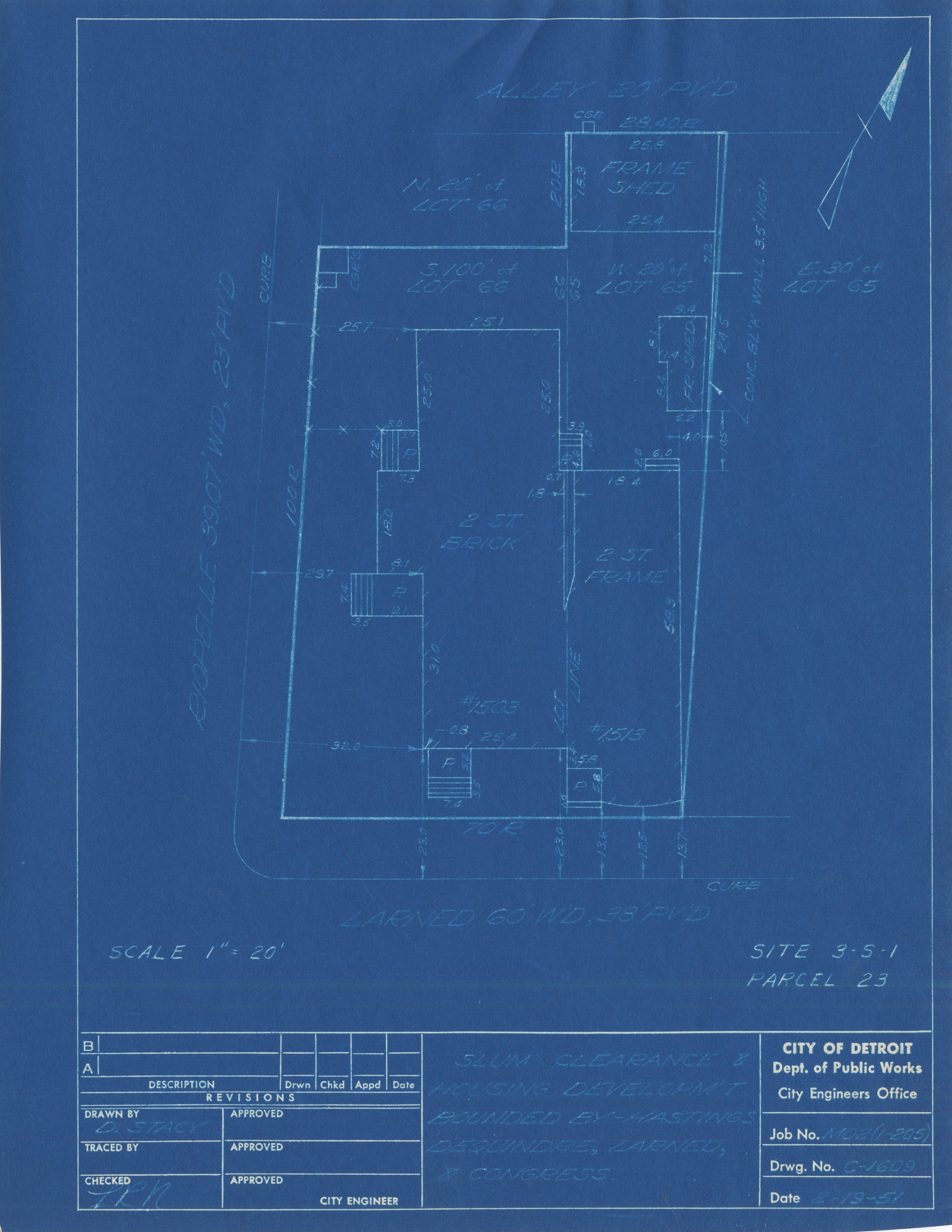Plot plan for property located on the corner of Larned and Riopelle, parcel 23, site 3-S-1. Recorded on blueprint: "Slum clearance & housing developm't bounded by Hastings, Dequindre, Larned & Congress."