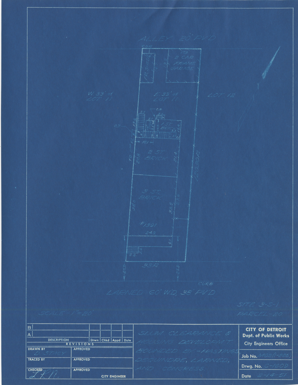 Plot plan for property located on Larned, parcel 20, site 3-S-1. Recorded on blueprint: "Slum clearance & housing developm't bounded by Hastings, Dequindre, Larned & Congress."