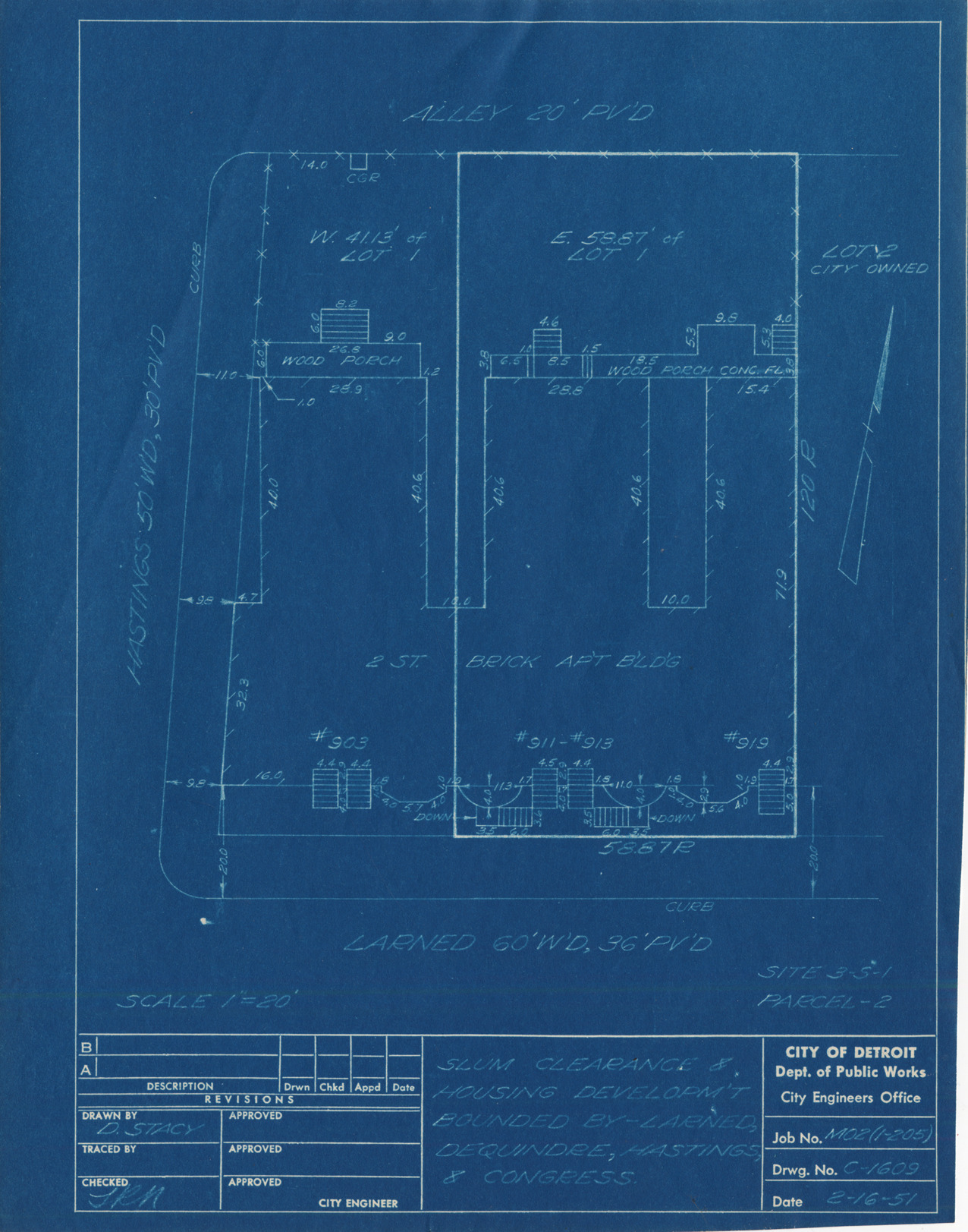 Plot plan for property located on Larned, parcel 2, site 3-S-1. Recorded on blueprint: "Slum clearance & housing developm't bounded by Larned, Dequindre, Hastings & Congress."