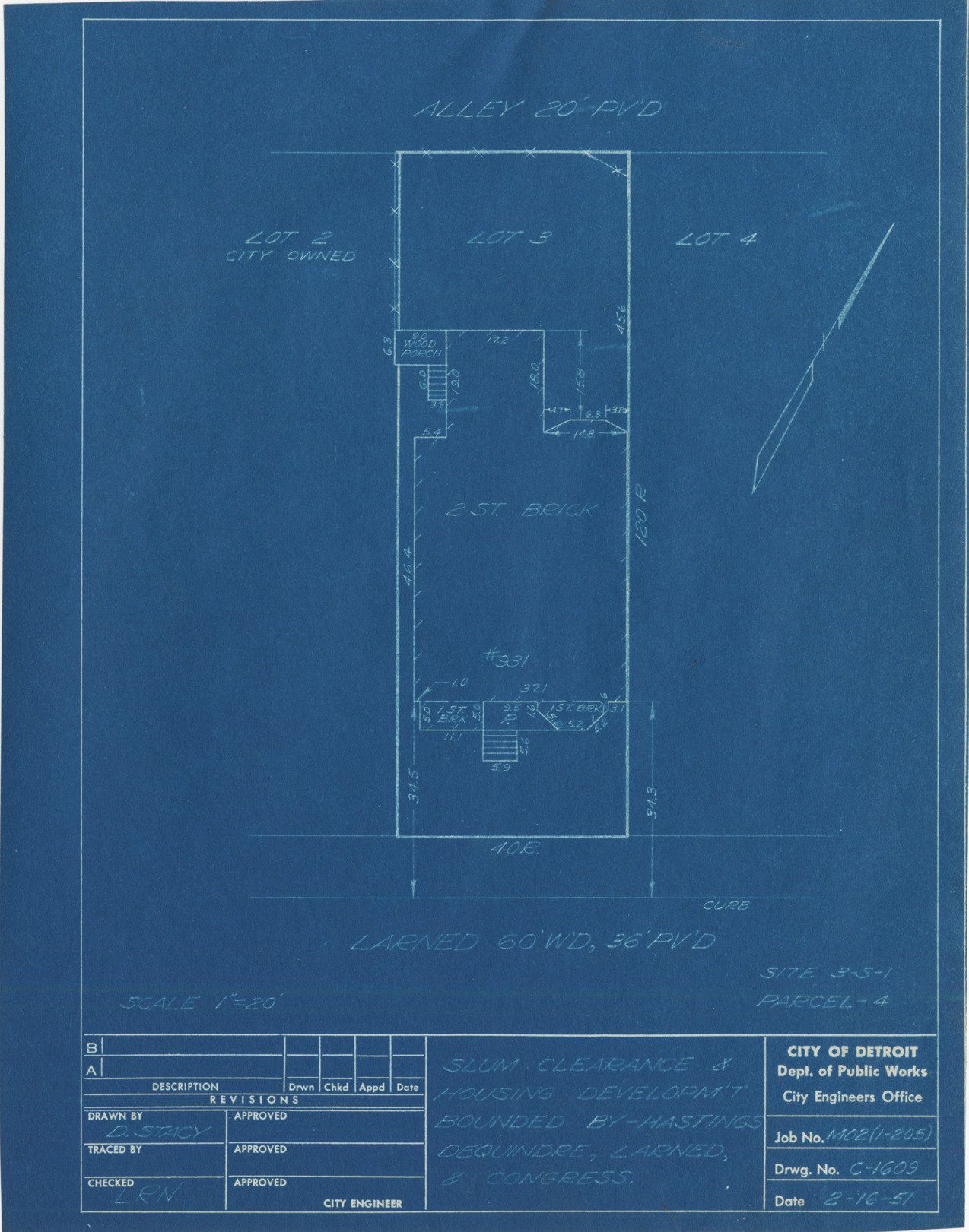 Plot plan for property located on Larned, parcel 4, site 3-S-1. Recorded on blueprint: "Slum clearance & housing developm't bounded by Hastings, Dequindre, Larned & Congress."
