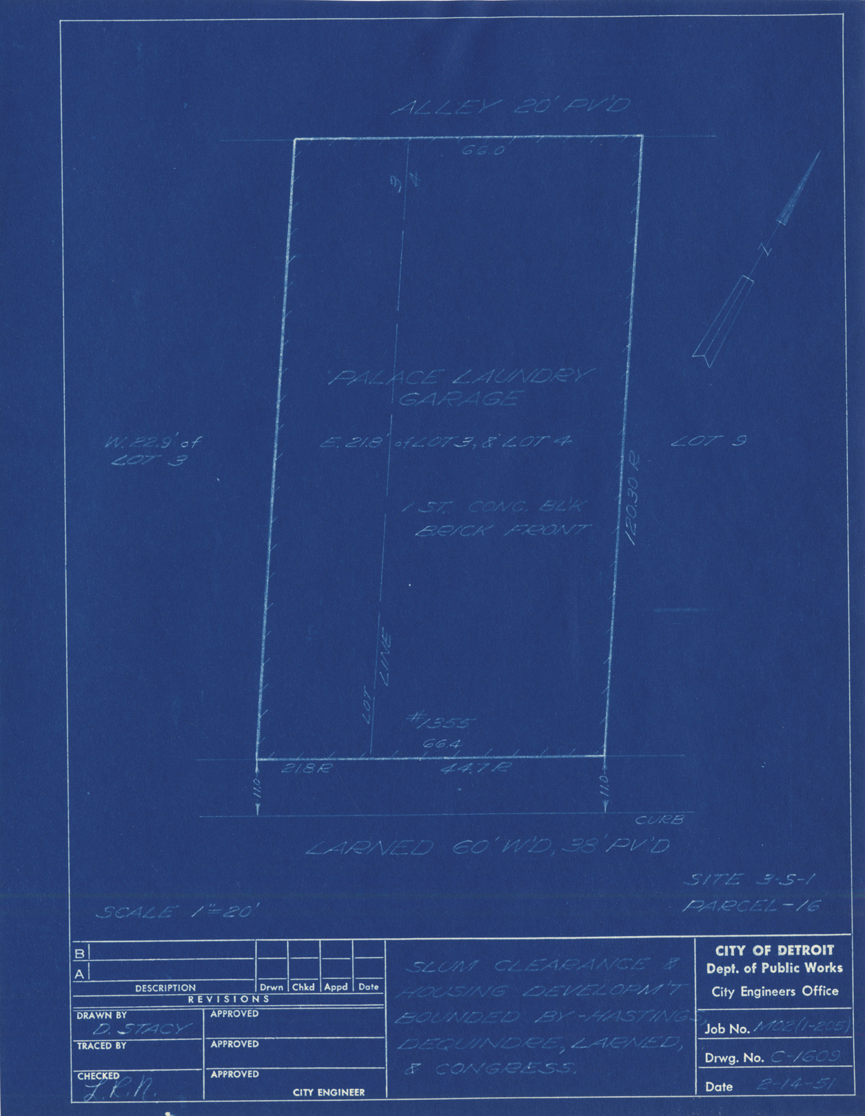 Plot plan for property located on Larned, parcel 16, site 3-S-1. Written on blueprint: "Palace Laundry garage." Recorded on blueprint: "Slum clearance & housing developm't bounded by Hastings, Dequindre, Larned & Congress."