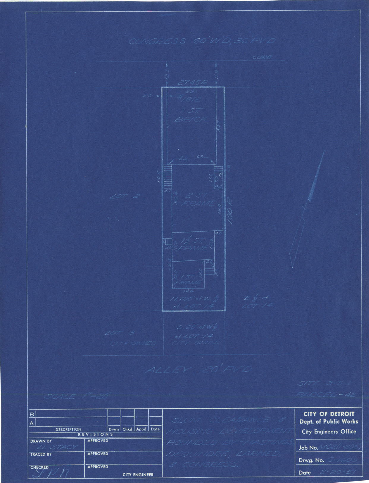 Plot plan for property located on Congress, parcel 42, site 3-S-1. Recorded on blueprint: "Slum clearance & housing development bounded by Hastings, Dequindre, Larned & Congress."