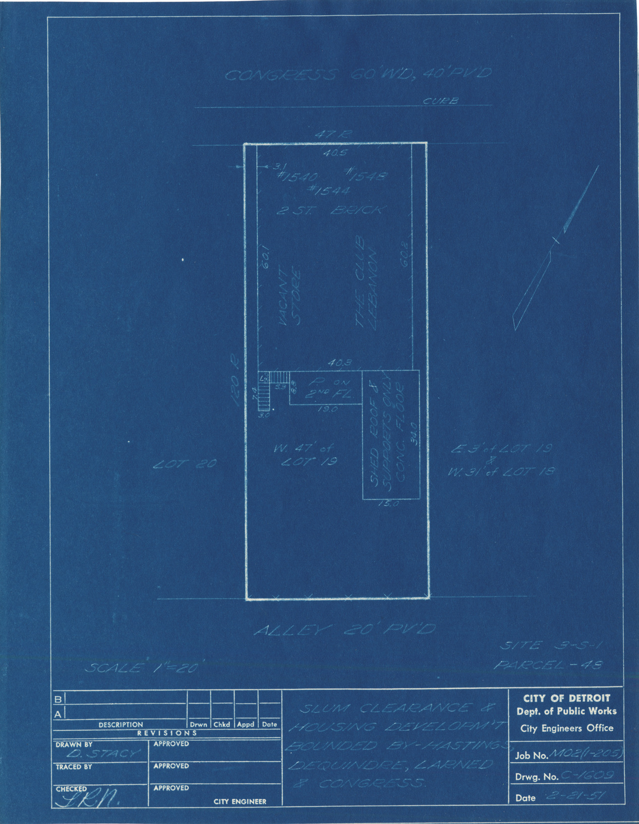 Plot plan for property located on Congress, parcel 48, site 3-S-1. Written on blueprint: "Vacant store, the Club Lebanon." Recorded on blueprint: "Slum clearance & housing developm't bounded by Hastings, Dequindre, Larned & Congress."
